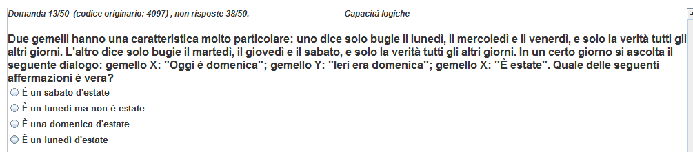 Partiamo dal fatto che se fosse davvero domenica, entrambi i gemelli dovrebbero aver detto la verità, cosa impossibile perché uno dice che è domenica e l'altro dice il contrario, quindi non è domenica e il gemello X sta mentendo: ne consegue che non è neanche estate. Invece Y sta dicendo la verità, quindi ieri era domenica: ne consegue che oggi è lunedì. La risposta corretta è quindi la seconda.